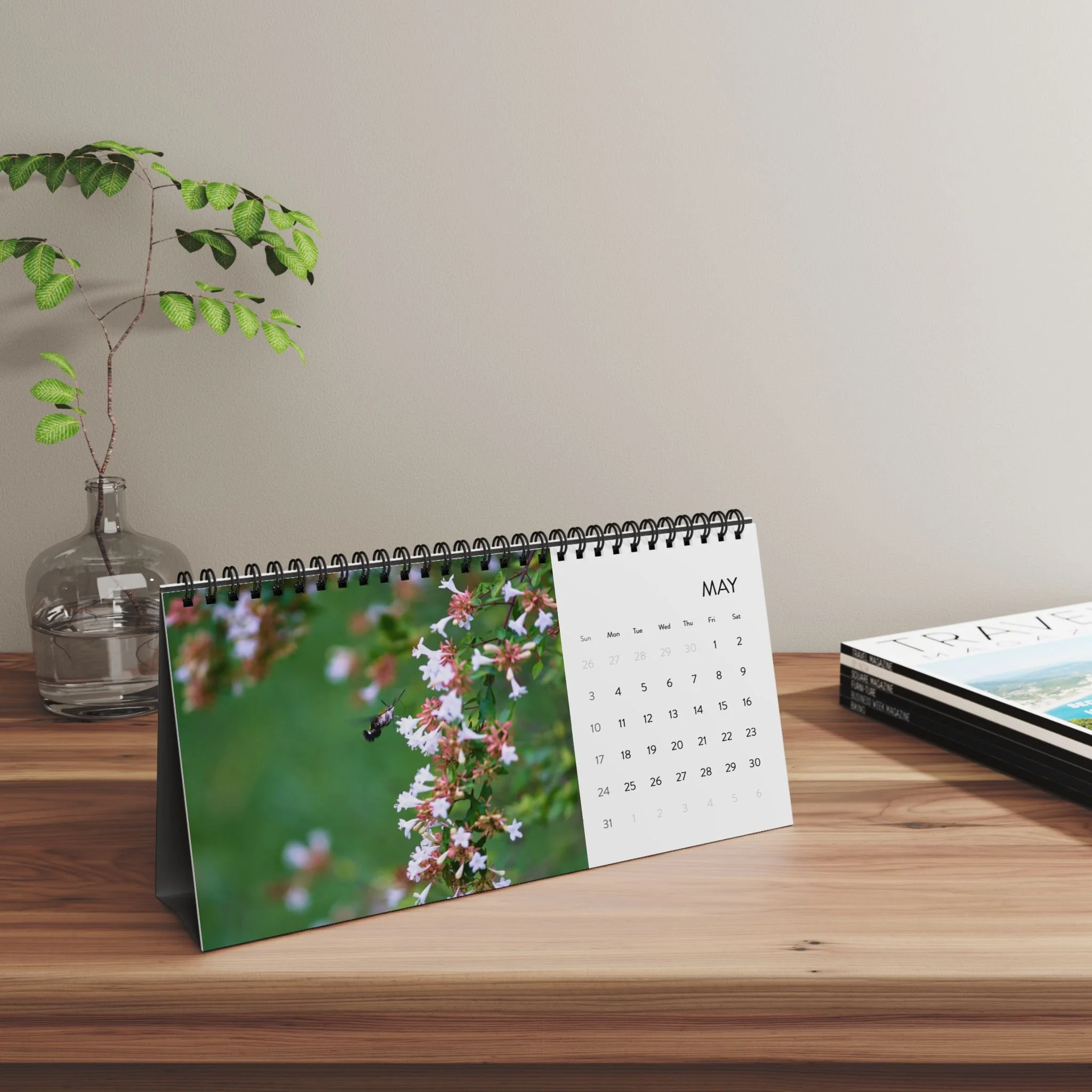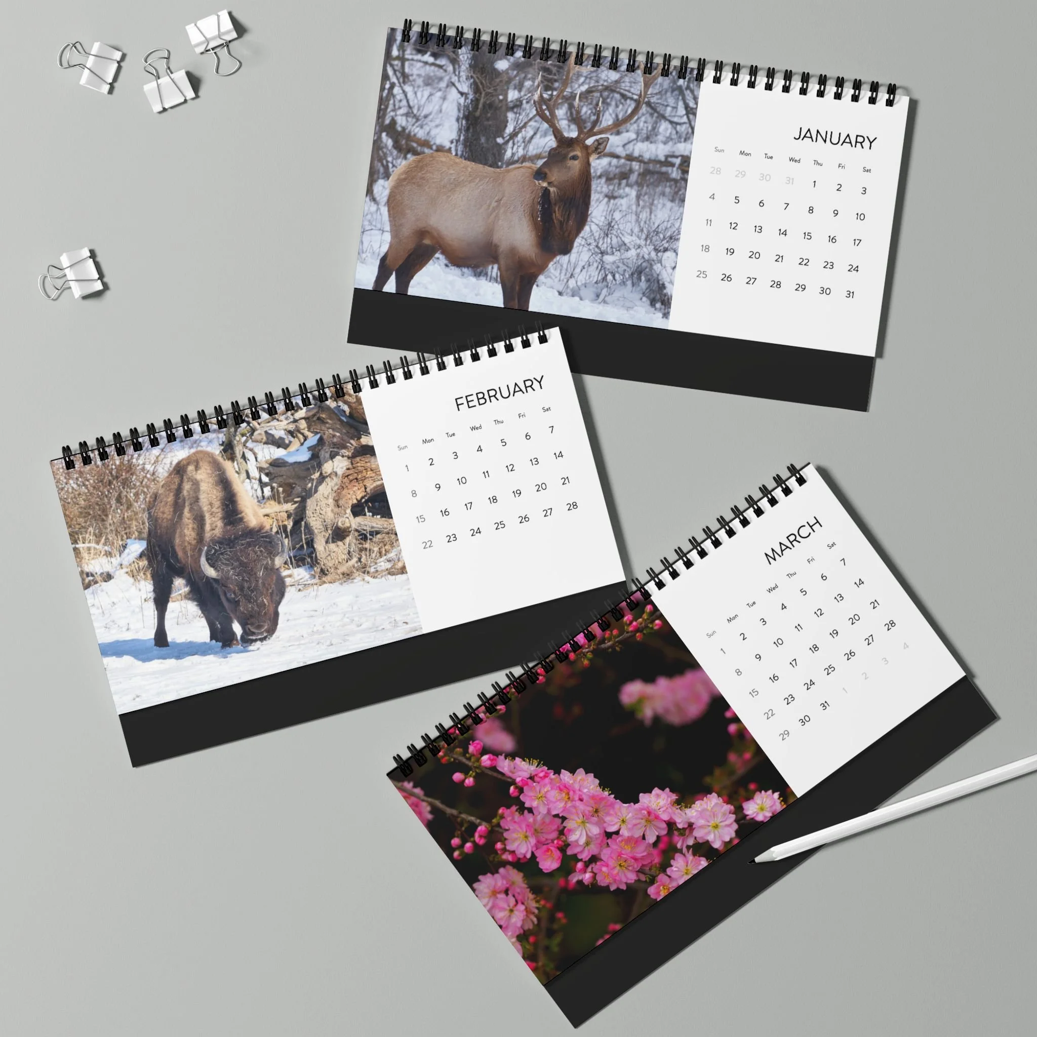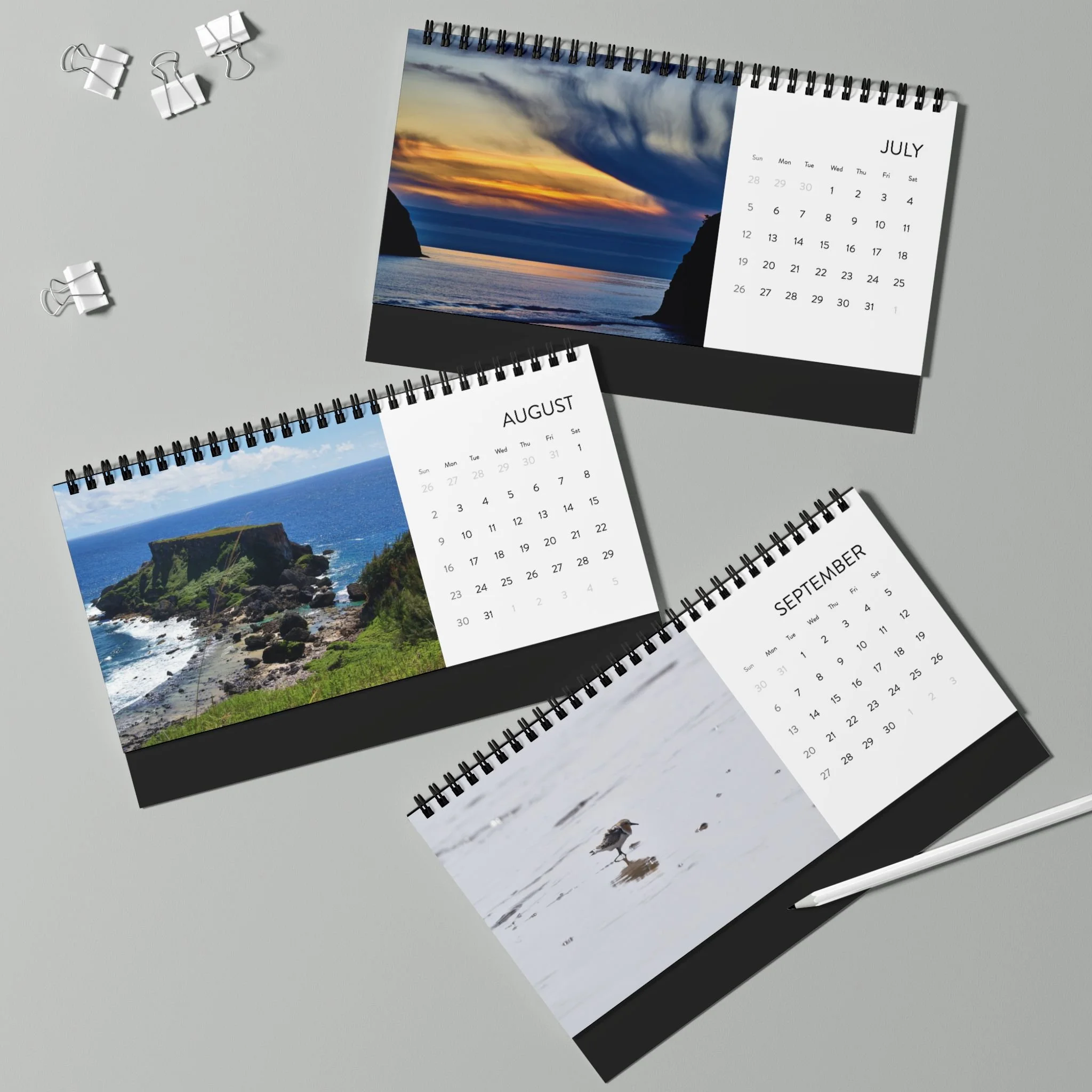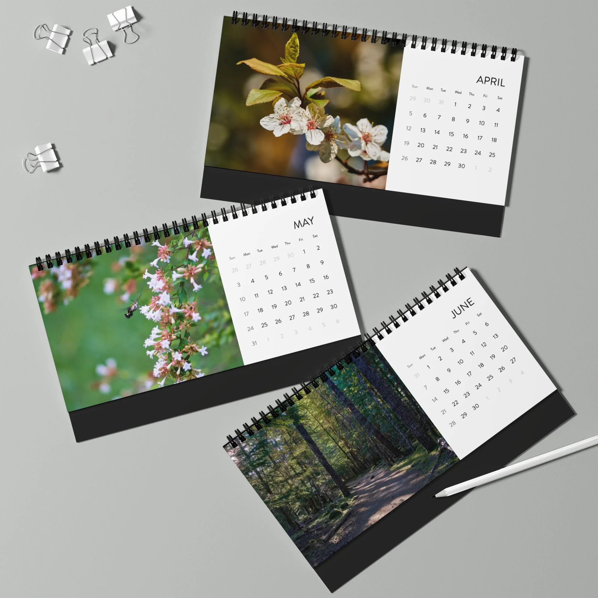 Celebrate the new year and keep track with this compact, beautifully printed 2026 desktop calendar that brings tranquil nature scenes to your your personal space from around the world. Each month pairs a crisp month-grid with a full-bleed photograph, letting calming scenes share your workspace without taking up much room. The black metal spiral and tent-card backing create a clean, professional display that flips easily from month to month. Made with thick 250 gsm matte paper for a refined, low-glare finish; inks stay vivid so colors remain true all year. Assembled in the USA with responsibly sourced paper—designed to sit neatly by your laptop, on a shelf, or beside a favorite mug.